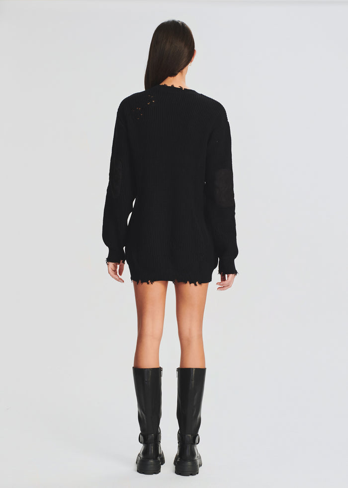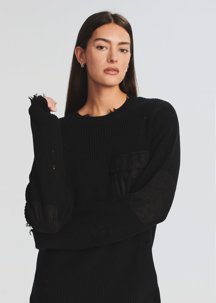 Oversized cotton knit sweater. Tonal faux suede chest pocket and patches at elbows. Light distressing at edges. Shown here in Black.