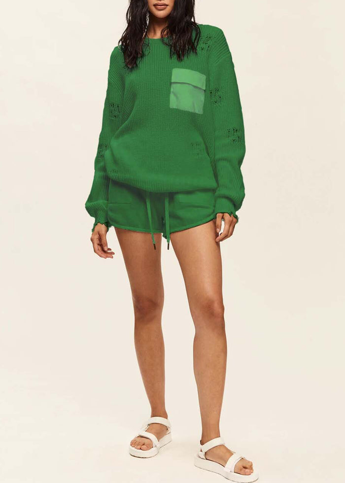 Oversized cotton knit sweater. Tonal faux suede chest pocket and patches at elbows. Light distressing at edges. Shown here in Amazon Green.