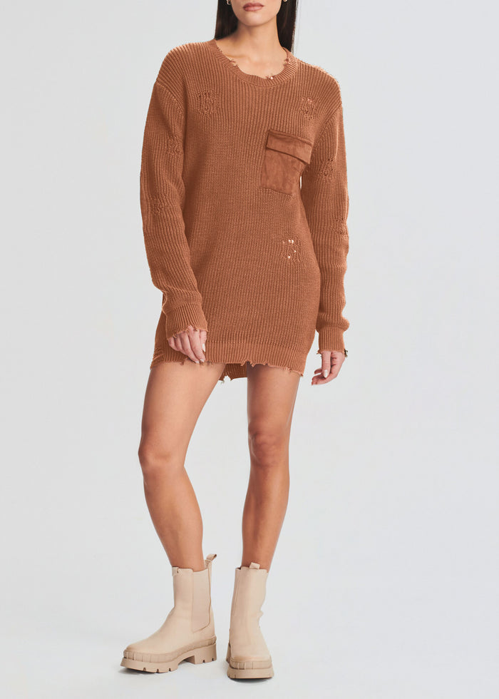 Oversized cotton knit sweater. Tonal faux suede chest pocket and patches at elbows. Light distressing at edges. Shown here in Cognac.