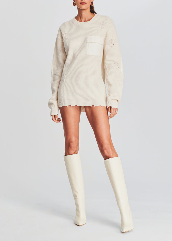 Oversized wool sweater. Tonal faux suede chest pocket and patches at elbows. Light distressing at edges. Shown here in Cream Wool.