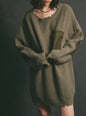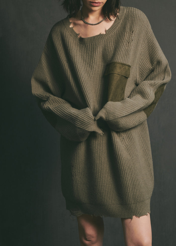 Oversized wool sweater. Tonal faux suede chest pocket and patches at elbows. Light distressing at edges. Shown here in Olive Wool.