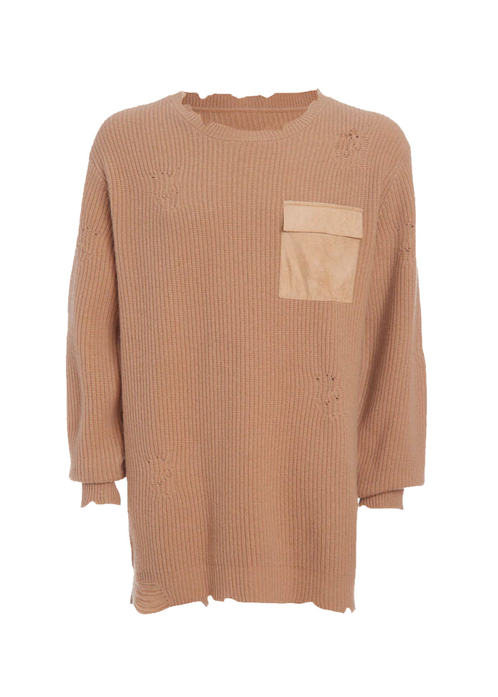 Oversized cotton knit sweater. Tonal faux suede chest pocket and patches at elbows. Light distressing at edges. Shown here in Tan.